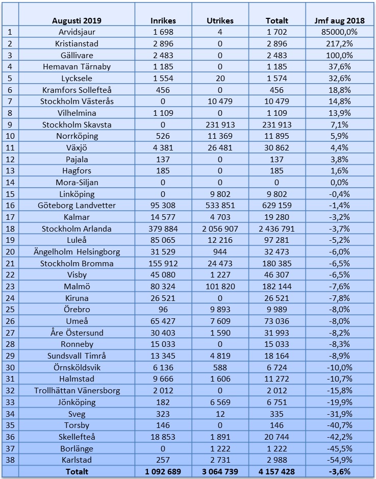 Tio av 38 flygplatser uppvisade en ökning av inrikesresenärer under augusti, delvis på grund av Nextjets konkurs under förra året, medan 17 flygplatser visade på fler utrikesresenärer. I utrikesligan toppar skånska Ängelholm Helsingborg Airport med en ökning på 667 procent utrikesresenärer på grund av ett utökat charterprogram i år jämfört med 2018.