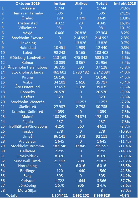 Sammantaget flög drygt 3,9 miljoner resenärer till eller ifrån samt inom Sverige under oktober 2019 vilket är en minskning med 4,6 procent jämfört med samma månad 2018. Av de 3,9 miljoner resenärer flög 1,3 miljoner inrikes vilket är 10,5 procent färre jämfört med oktober föregående år och utrikes flög då drygt 2,6 miljoner resenärer vilket även det är en minskning, men betydligt mindre än inrikesflygandet, på 1,4 procent. Det återstår att se om november och eller december kan bryta trenden av idel negativ passagerarutveckling totalt sett för Sverige, eller om hela 2019 ska visa på ett minskat antal flygresenärer.