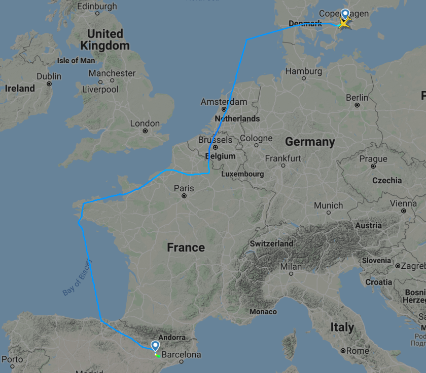 Efter ett markstopp i Köpenhamn fortsatte MAX-flygplanet sedan till spanska Lleida utanför Barcelona med klaffarna nere och en marschhöjd på cirka 5 500 meter. Flygtiden på sträckan blev fyra timmar och 45 minuter som förutom en lägre hastighet berodde på en krokig flygväg. En normal flygtid mellan Köpenhamn och Barcelona är på två timmar och 40 minuter.