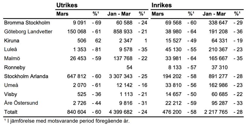 Stockholm Arlanda Airport, Sveriges största flygplats, hade sammanlagt 842 000 resenärer under mars, vilket är en minskning med 60 procent jämfört med samma månad föregående år. Antalet utrikesresenärer uppgick till 648 000, vilket är en minskning med 60 procent, medan antalet inrikesresenärer uppgick till 194 000, en minskning med 58 procent.