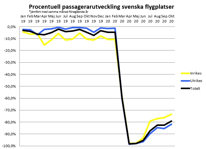 De 39 svenska flygplatser som Transportstyrelsen för passagerarstatistik över visade en positiv utveckling i oktober jämfört med september då trafiken totalt sett ökade med drygt 15 procent och 32 av de 39 flygplatserna visade på passagerarökningar jämfört med september. Trots en återhämtning i oktober så är det ett dystert läge för den svenska flygtrafiken med den ökade smittspridningen av COVID-19 som återigen dämpar resandet.