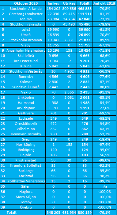 De fem största flygplatserna i landet i oktober var Stockholm Arlanda (-79,3%), Göteborg Landvetter (-81,1%), Malmö (-73,1%), Stockholm Skavsta (-78,8%) och Luleå (-61,3%). Noterbart är att Malmö, Stockholm Skavsta, Luleå och Umeå passerade Bromma flygplats i oktober 2020 jämfört med oktober 2019 då cityflygplatsen i Stockholm placerar sig på en sjunde plats på listan över landets största flygplatser i oktober. Bromma flygplats har drabbats hårt av coronapandemin då flygplatsens största operatör BRA gick in i en rekonstruktion, som en konsekvens av pandemin, under våren och inte har återupptagit sin linjetrafik med Bromma som nav. Air Leap, Air Gotland och Amapola Flyg har däremot ersatt BRA på ett flertal linjer från Bromma och BRA har planer på att återuppta sin linjetrafik till och från Bromma flygplats under det första kvartalet nästa år.