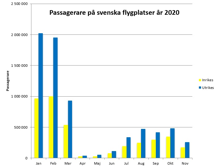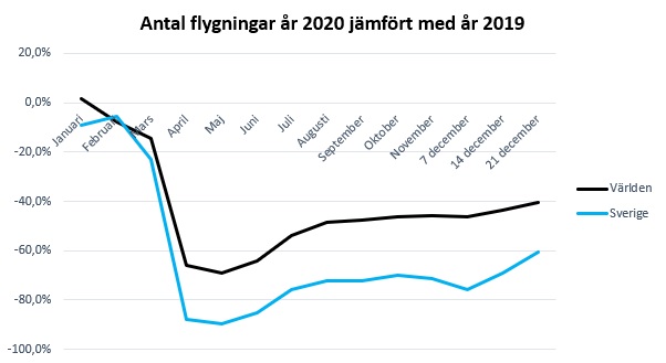 Sverige är enligt John Hopkins University på plats 31 på listan över länder med döda i COVID-19. Landets BNP förväntas minska med fyra procent under 2020, något som är betydligt bättre än genomsnitt i euroområdet där BNP i genomsnitt förväntas minska med nästan åtta procent under 2020. För flygtrafikens del har år 2020 varit ett år som ingen på förhand hade kunnat se. Pandemin har kört passagerarsiffror, intäkter och lönsamheten i botten hos många flygbolag och i slutet av december var antalet avgångar och ankomster på de svenska flygplatserna 70 procent lägre jämfört med 2019 sedan mars månad. Passagerarminskningen för perioden mars till oktober var ännu värre, minus 86 procent jämfört med samma period år 2019.