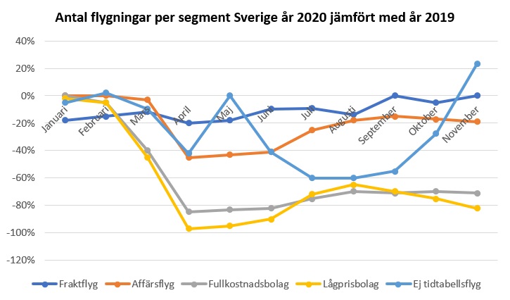 Ett segment som ligger långt över nivåer från år 2019 är icke tidtabellsflygningar. Det kan exempelvis vara ad-hoc flygningar och charterflygningar som ökat kraftigt i Sverige under hösten. Det är troligen så att exempelvis företag och idrottslag använder sig av ”egna” flygplan i större utsträckning än tidigare i ett försök att minimera kontakterna med fler personer än nödvändigt. En brist på vanliga kommersiella passagerarflygningar, samtidigt som behov av att transportera arbetare finns kvar kan också vara en anledning till denna ökningen. Det är dock stora variationer från månad till månad och därför är utvecklingen för icke tidtabellsflyg svår att fastställa som säkert positiv. En orsak till de olika förändringarna mellan månaderna för icke tidtabellsflyg kan vara att antalet flygningar inom segmentet är få och därav blir det stora procentuella förändringar vid små förändringar sett till antal flygningar.