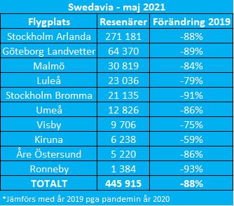 Under maj flög 446 000 resenärer via Swedavias tio flygplatser vilket är en minskning med 88 procent jämfört med maj 2019, före pandemin, då Swedavia hade 3 636 000 resenärer. Enligt Swedavia hade inrikestrafiken en bättre utveckling än utrikestrafiken då inrikesresenärer minskade med 83 procent och utrikesresenärer med 90 procent.