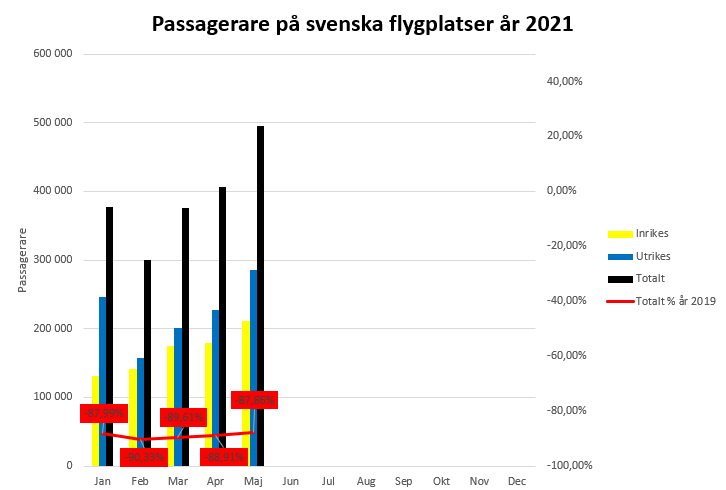 Det är fortsatt inrikestrafiken som återhämtar sig bäst. I maj ökade antalet inrikespassagerare med 629 procent medan antalet utrikespassagerare ökade med 408 procent jämfört med maj år 2020. Jämfört med före coronapandemin låg inrikestrafiken 84 procent lägre och utrikestrafiken 90 procent lägre i maj. Trenden med att man främst reser inrikes för att undvika test- och karantänskrav fortsätter och ett starkt inrikesresande under sommaren förväntas med ”hemester”. Samtidigt kommer troligen utrikestrafiken att få upp återhämtningstakten under sommaren efter att flera turisterländer öppnar upp och vaccinationspass och vaccinationsprogrammen i Europa går framåt. Även EASA och ECDC:s (EU:s smittskyddsmyndighet) nya riktlinjer till EU-länder om att låta vaccinerade och de som haft COVID-19 inom 180 dagar från resans dag ska undantas från test- och karantänskrav kommer bidra till ett ökat utrikesresande om länderna väljer att använda sig av riktlinjerna.