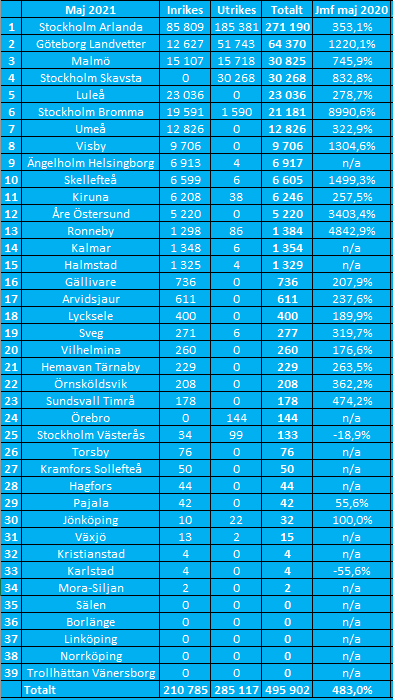 Stockholm Arlanda var som vanligt störst i maj med 271 190 passagerare vilket är en ökning med 353 procent jämfört med maj år 2020 då trafiken var mycket låg i hela landet. Tvåa är Göteborg Landvetter med 64 370 passagerare (+1 220%), följd av Malmö 30 825 (+746%), Stockholm Skavsta 30 268 (+833%) och Luleå (+279%) som rundar av topp fem. På sjätte plats återfinns Stockholm Bromma som fått upp farten under maj med en ökning på 8 991 procent av passagerare jämfört med maj år 2020. Antalet passagerare ökade även med närmare 160 procent i maj jämfört med april och den främsta orsaken till ökningen är BRAs återlansering av reguljär flygtrafik till och från cityflygplatsen.