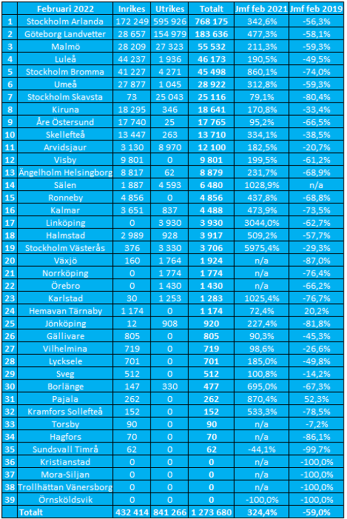 Som vanligt var Stockholm Arlanda landets största flygplats i februari med drygt 768 000 resenärer motsvarande 60 procent av alla flygresenärer i landet. De 768 000 passagerarna är ungefär 56 procent färre jämfört med före pandemin för Arlanda men 343 procent fler jämfört med februari år 2021. Både Ryanair och Finnairs etablering av nya linjer på Arlanda bidrar till den positiva utvecklingen jämfört med förra året men framförallt Ryanair som är ett av de flygbolag i Europa som återhämtat sig bäst sedan pandemins lågpunkt. Bakom Stockholm Arlanda på listan över de största flygplatserna i landet under februari återfinns fler Swedavia-flygplatser, Göteborg Landvetter, Malmö, Luleå, Stockholm Bromma och Umeå. På sjunde plats finns den första icke-statliga flygplatsen, Stockholm Skavsta som hade 25 116 passagerare i februari. Skavsta kommer troligen inte att komma upp på nivåerna före pandemin på ett bra tag eftersom man förlorat Ryanairs trafik och enbart har reguljära flygningar med Wizz Air i nuläget.